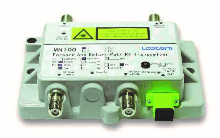 Overview        Lootom MN100 RF PON Transceiver offer the operators competitive advantage and enormous flexibility over the traditional HFC architectures --- avail enough the existing RF and DOCSIS technology to deploy a fiber optic distribution network. Lootom MN100 operate over a standard Passive Optical Network(PON) ODN architectures using a standard HFC optical wavelength, connect to cable modems, televisions and set-top boxes through the existing coaxial cable, don’t need the neighboring HFC nodes and the annual testing and maintenance. Lootom MN100 allows PON, RFoG and mixed PON network to extend the bi-directional and interactive RF business through the passive optic distribution network, it could be used at the same optic cable which PON access to support the voice, video and data business. Lootom MN100 RF transceiver provides bi-directional services over extended RF frequencies (up to 1.1GHz) while being agnostic to head-end equipment, customer equipment, and compatible with today’s operating processes. Features         For FTTH